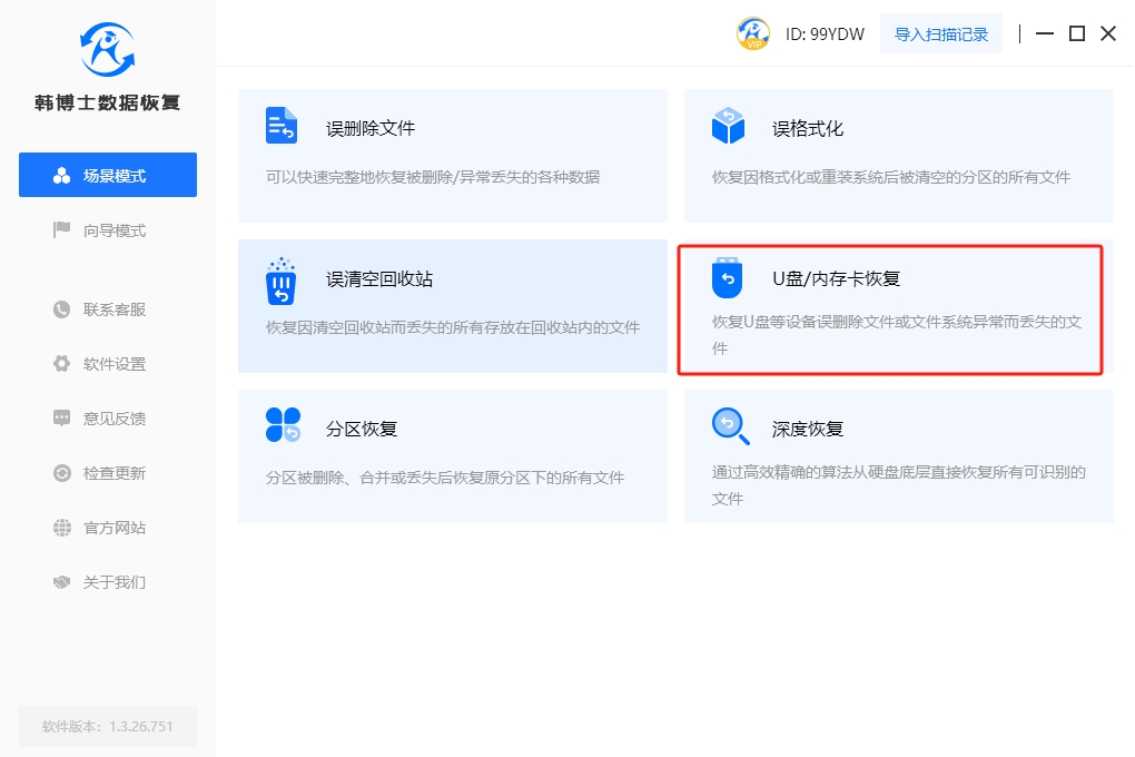1. 要執(zhí)行數(shù)據(jù)恢復(fù)操作,首先雙擊打開(kāi)韓博士,進(jìn)入軟件界面,然后找到“場(chǎng)景模式”,選擇“U盤(pán)/內(nèi)存卡恢復(fù)”。