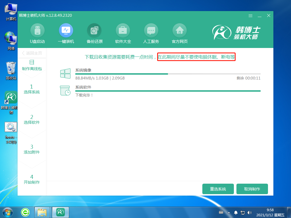11.進(jìn)入部署環(huán)境狀態(tài)。經(jīng)過部署安裝后,韓博士會彈出重啟界面,我們可以點(diǎn)擊“立即重啟”,也可等待電腦自行重啟。