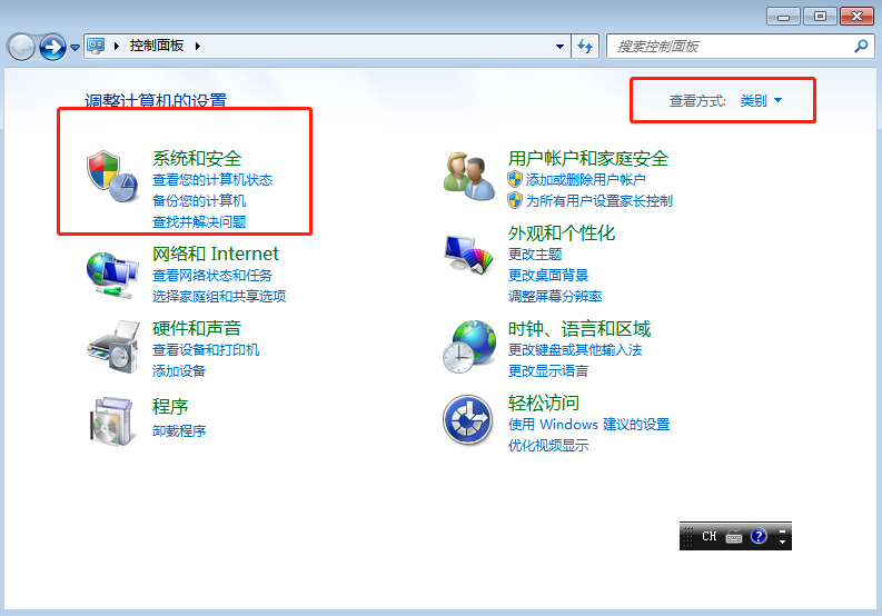 2.在打開的控制面板界面中將“查看方式”改為“類別”,選擇“系統(tǒng)和安全”進(jìn)入;