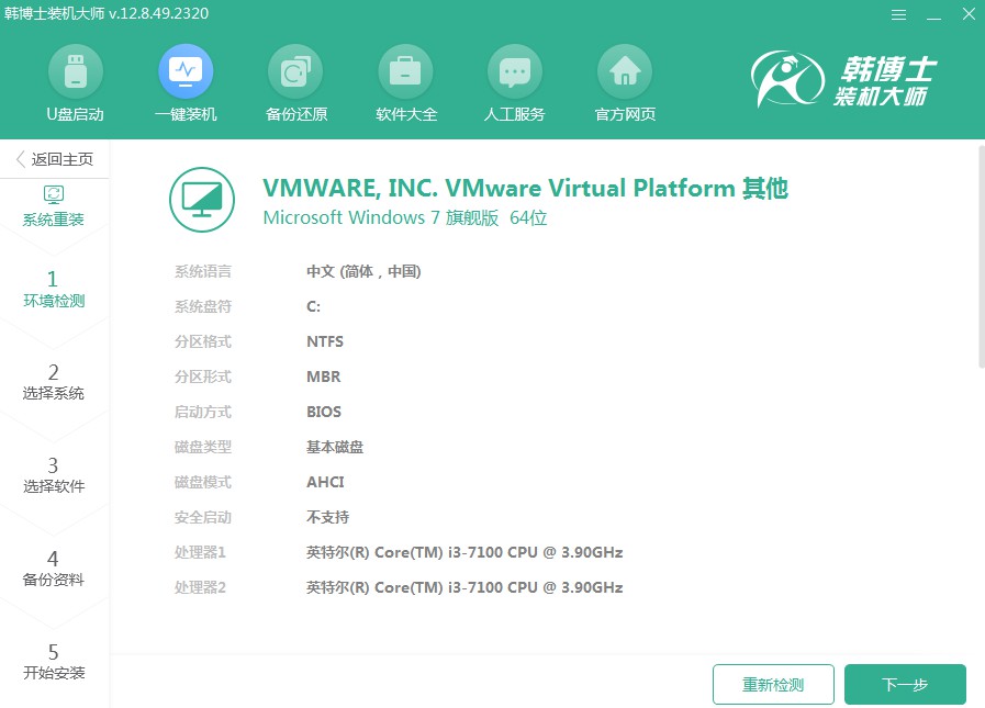 第二步,當(dāng)前系統(tǒng)正在進(jìn)行“環(huán)境監(jiān)測”,您無需干預(yù),檢測完成后請單擊“下一步”。