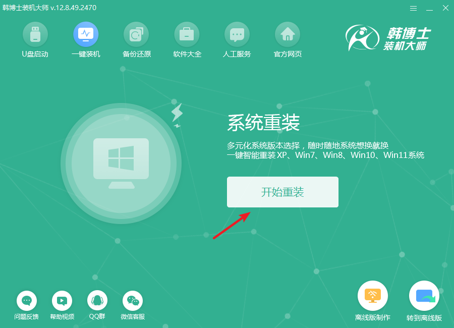1.首先從韓博士官網(wǎng)獲取裝機(jī)大師軟件,完成下載安裝后,打開(kāi)軟件,直接選擇“開(kāi)始重裝”,跟隨系統(tǒng)提示操作就行了。